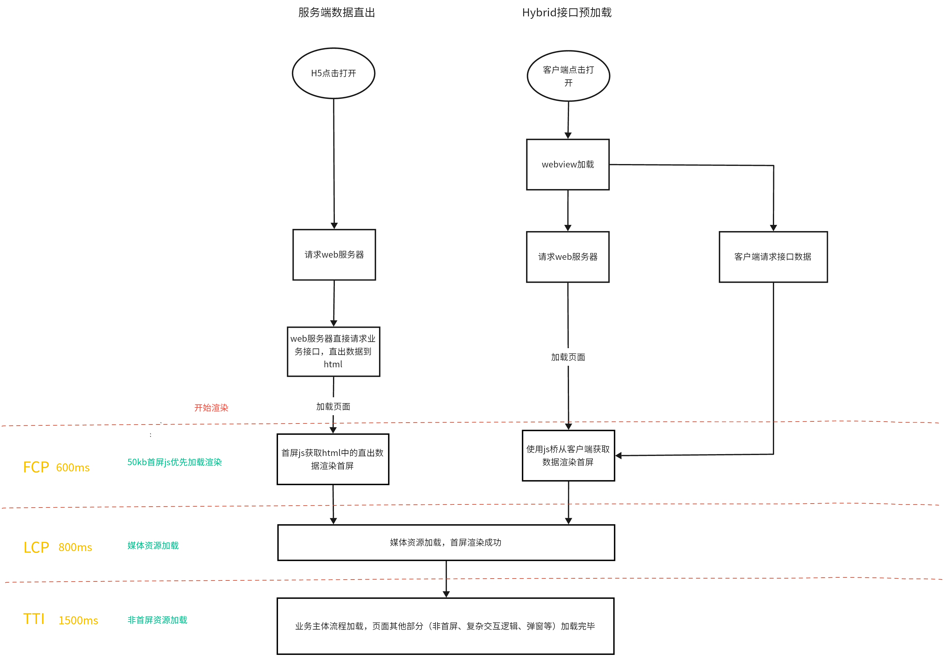 | Hybrid(H5 快照、WebView 缓存等) | 将用户访问过的 H5 页面内容缓存至客户端,二次访问时优先展示缓存内容,同步更新最新数据后刷新页面 | 二次访问速度接近原生 | • 首次访问体验无改善 • 仅适用于 App 内场景 • 存在敏感信息泄露风险 |
