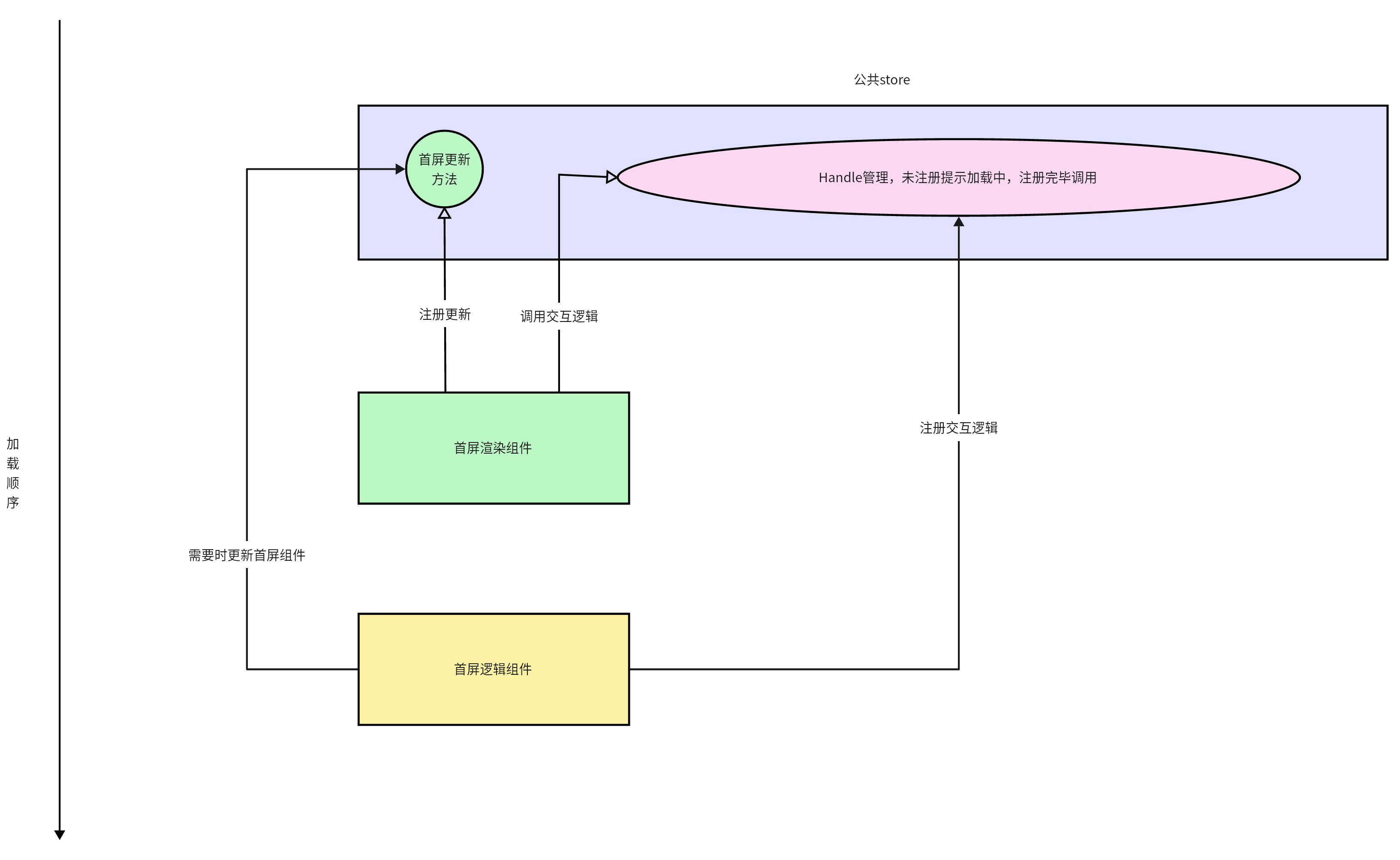 两个组件之间通过 Handle 管理机制进行协调。 当首屏逻辑组件尚未加载完成时,Handle 管理器会对用户的交互操作进行临时处理,显示"未注册提示添加中"的状态。